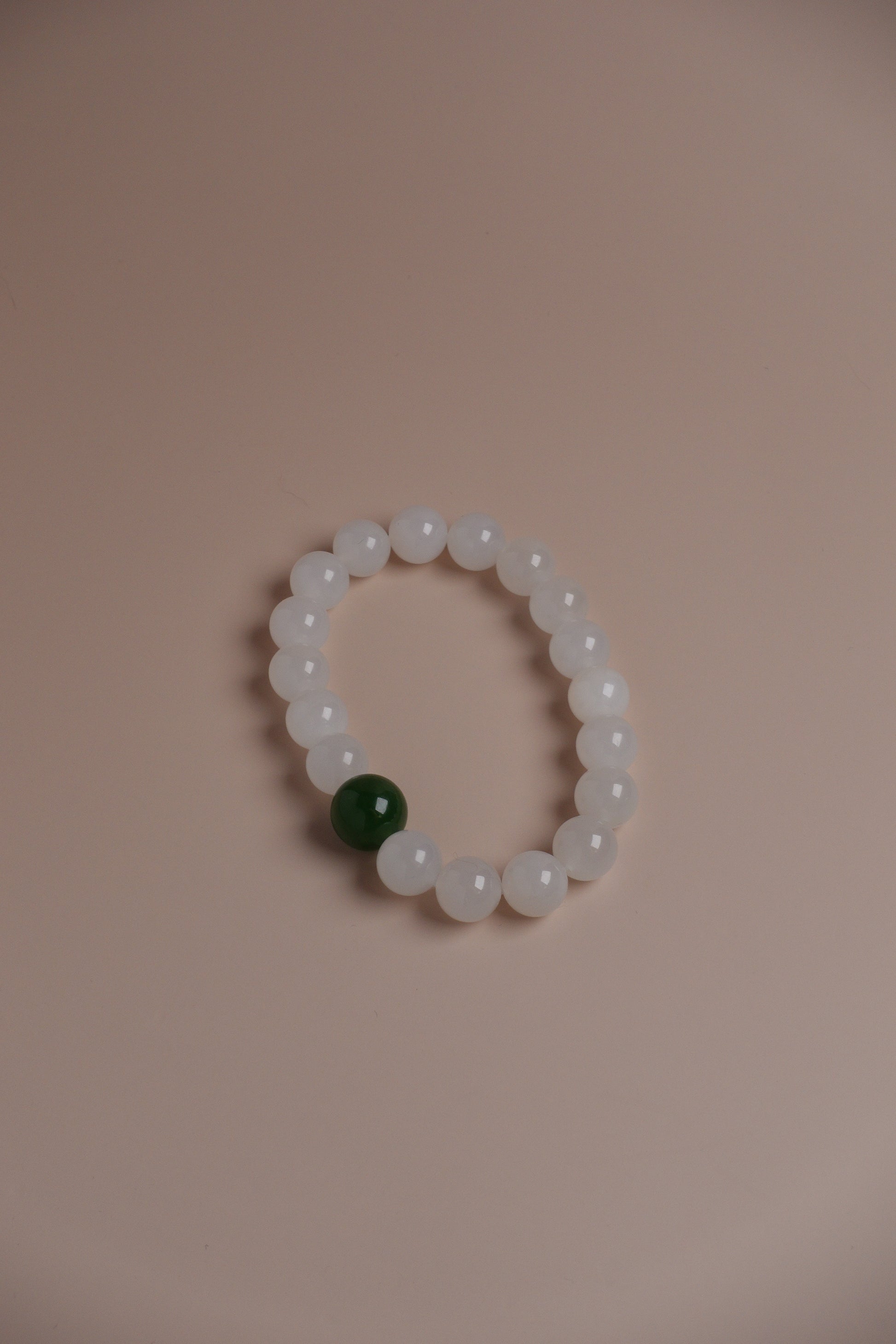 • Contrasting design with one vivid green jade bead among luminous white jade