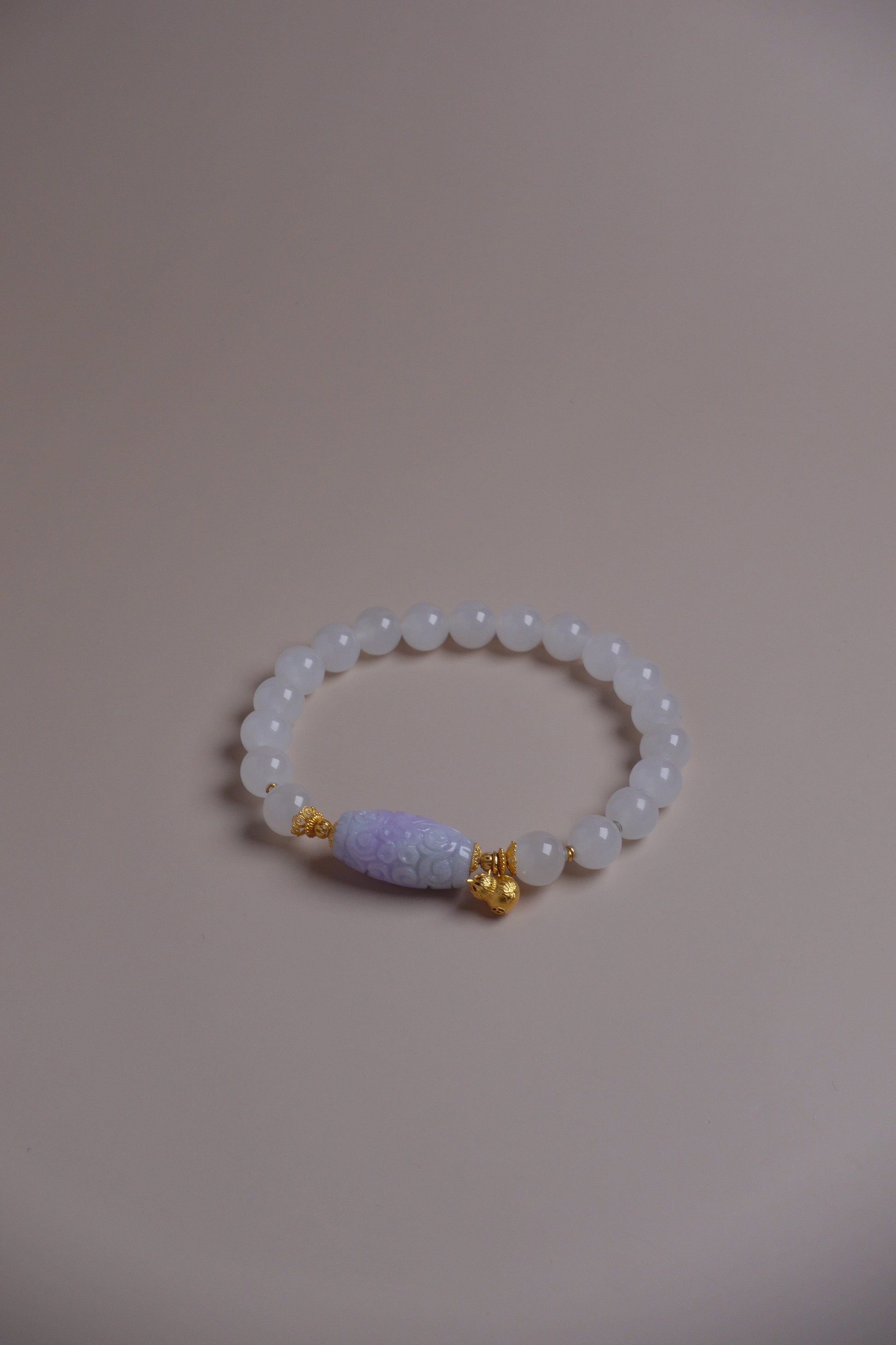 • Soft white jade paired with a single lavender jadeite bead for a calm, elegant contrast